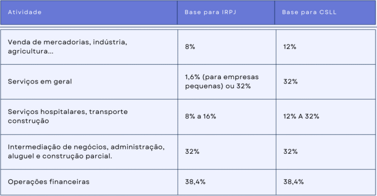 O Lucro Presumido é um regime tributário onde calcula o Imposto de Renda da Pessoa Jurídica (IRPJ) e a Contribuição Social sobre o Lucro Líquido (CSLL) com base na margem de lucro estimada pela Receita Federal, conforme presunção apresentada na tabela abaixo: